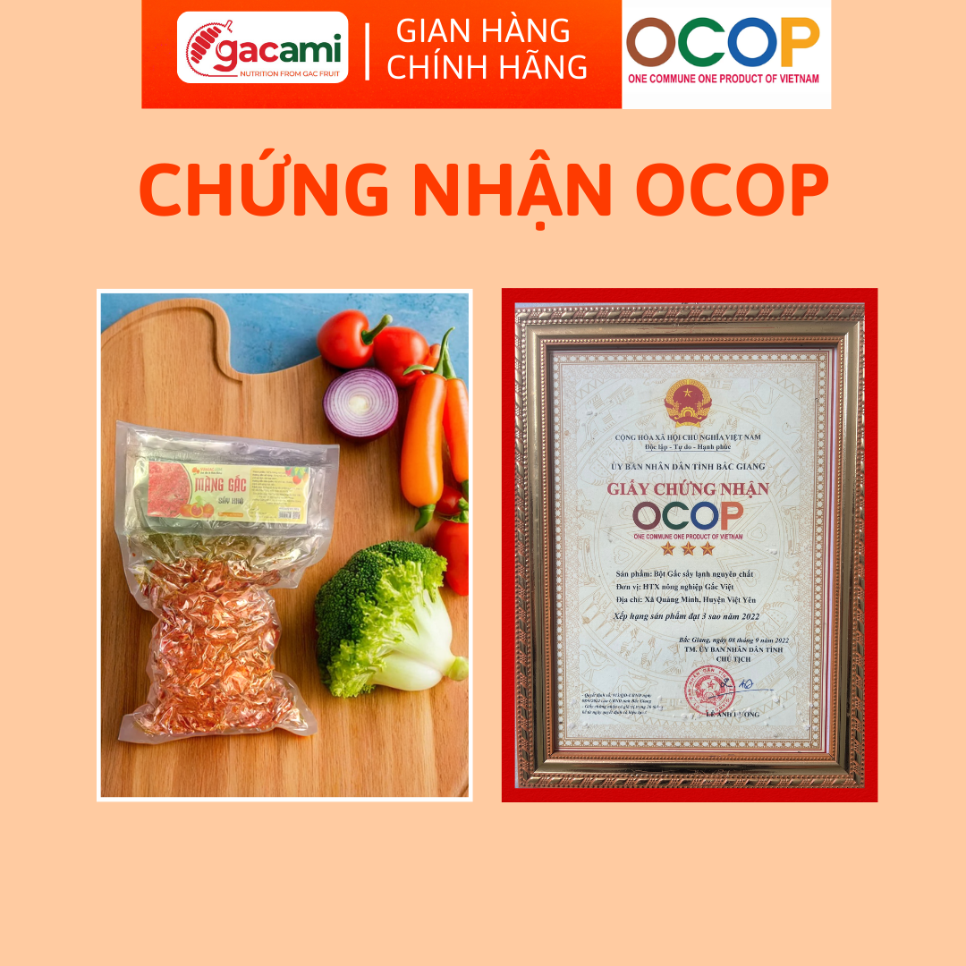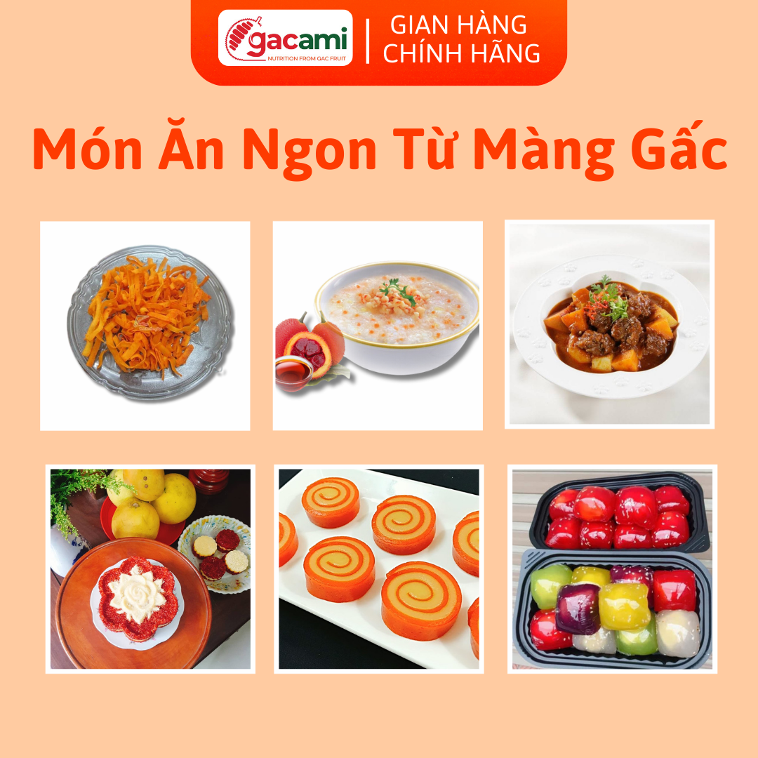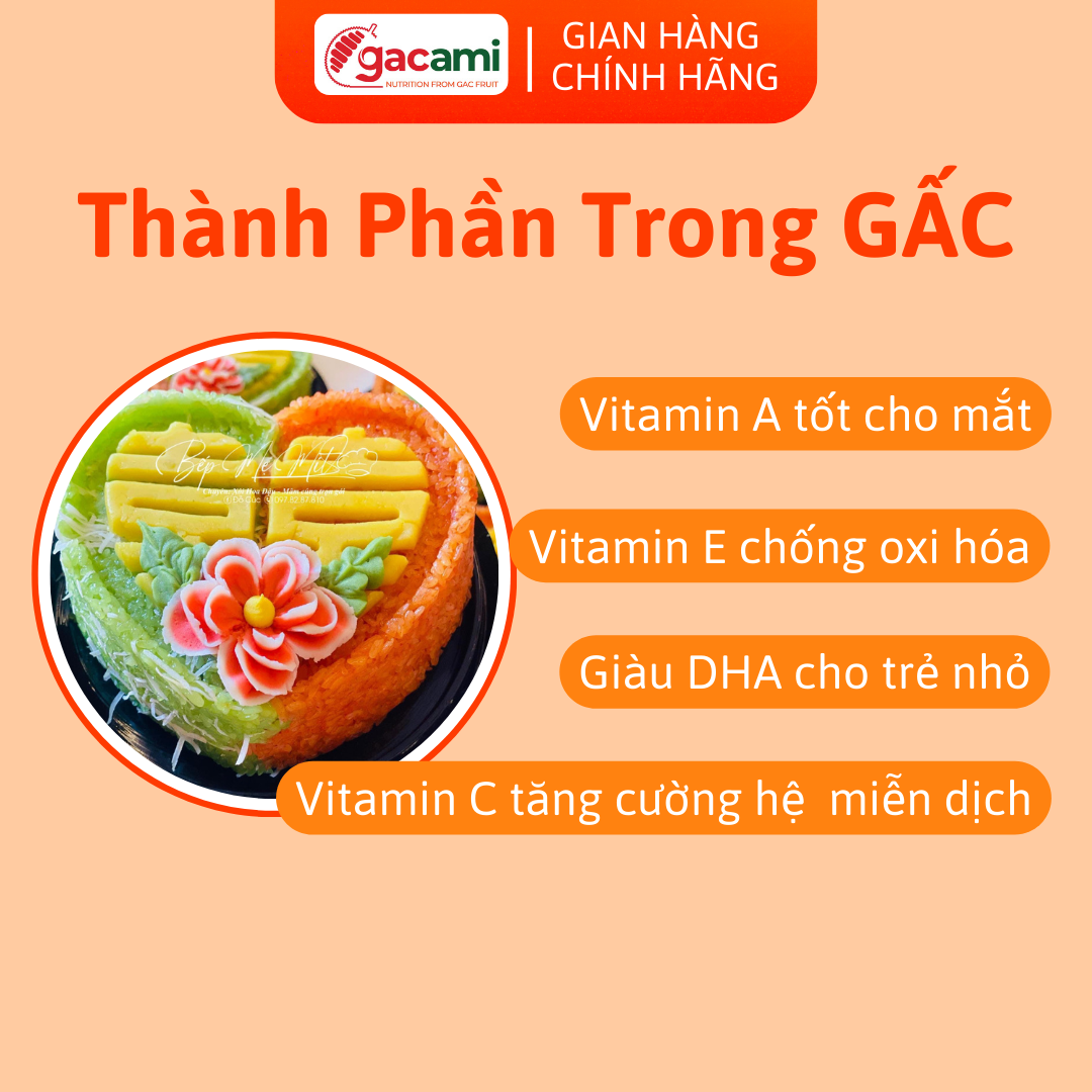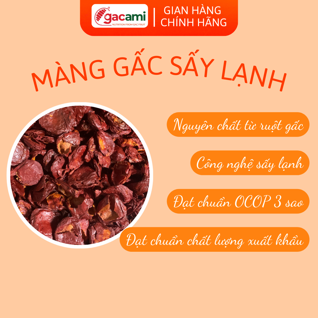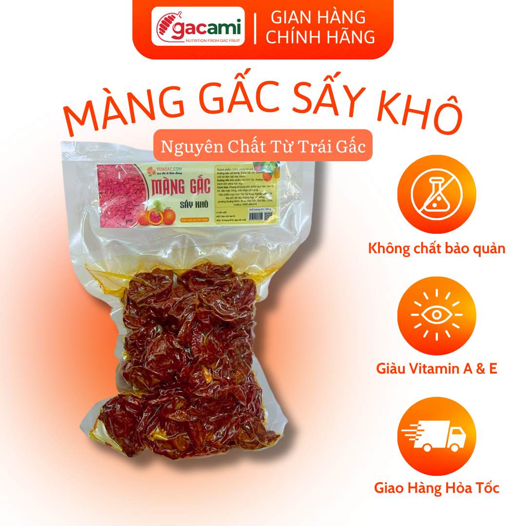 Những thành phần có trong màng gấc sấy khô và công dụng Màng gấc có chứa Beta Caroten, Lycopen, Vitamin E, rất nhiều chất béo thực vật như Oleic, Linoleic, Stearic, Palmatic… và các vi chất rất cần thiết cho cơ thể con người.